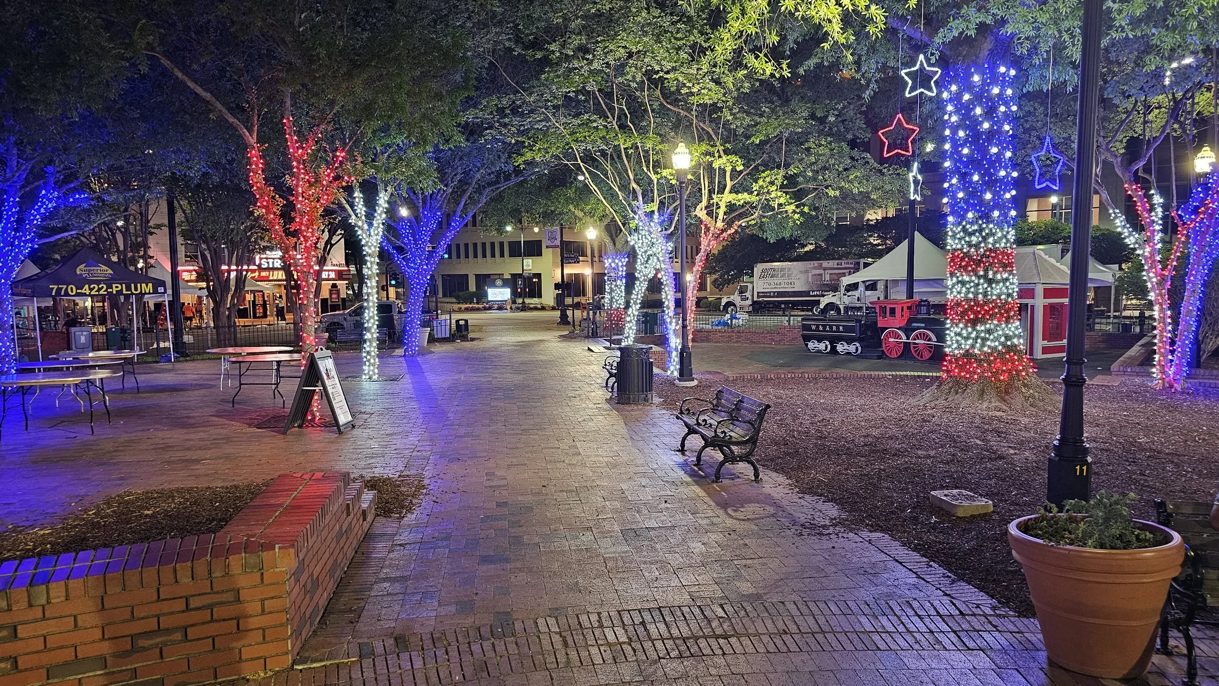 We’re proud to be Marietta’s trusted lighting partner since 2019! This year we had the honor of decking out Glover Park in Red White and Blue for this year’s 250th Independence Day Celebration! Our team was excited to get this very festive, very creative display installed just in time for the first weekend of concerts and gatherings to kick off the Spring / Summer programs!